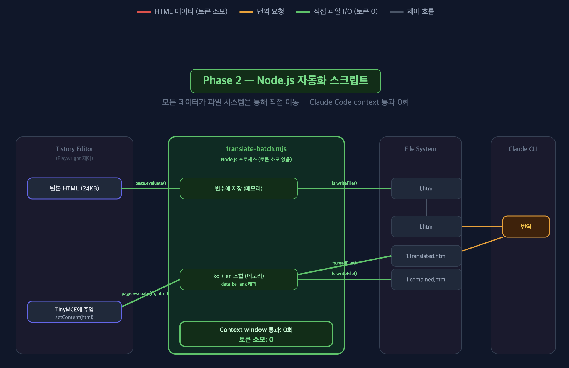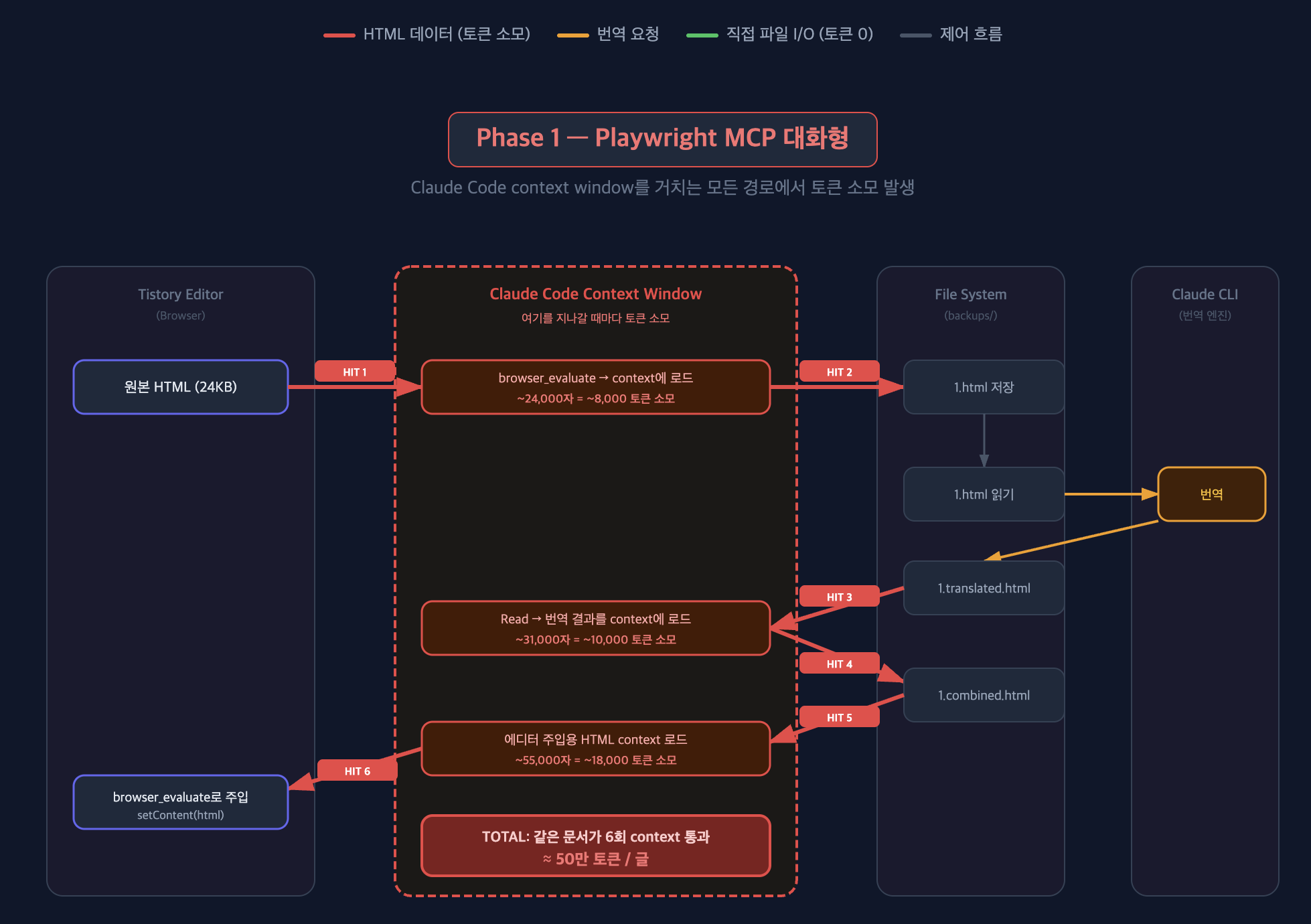결국 번역은 claude CLI 가 하고, 브라우저 제어는 playwrite가 함. 그러나 HTML 문서 내용이 claude code context 를 잡아먹는 구조로 동작하고 있음을 직감적으로 생각했고(근데 6번이나 될 줄이야) node.js 스크립트가 playwrite + fs + claude cli 를 직접 연결하면 claude code 의 context window 를 우회해서 token 을 아껴야겠다고 생각했다.