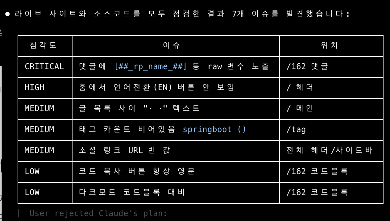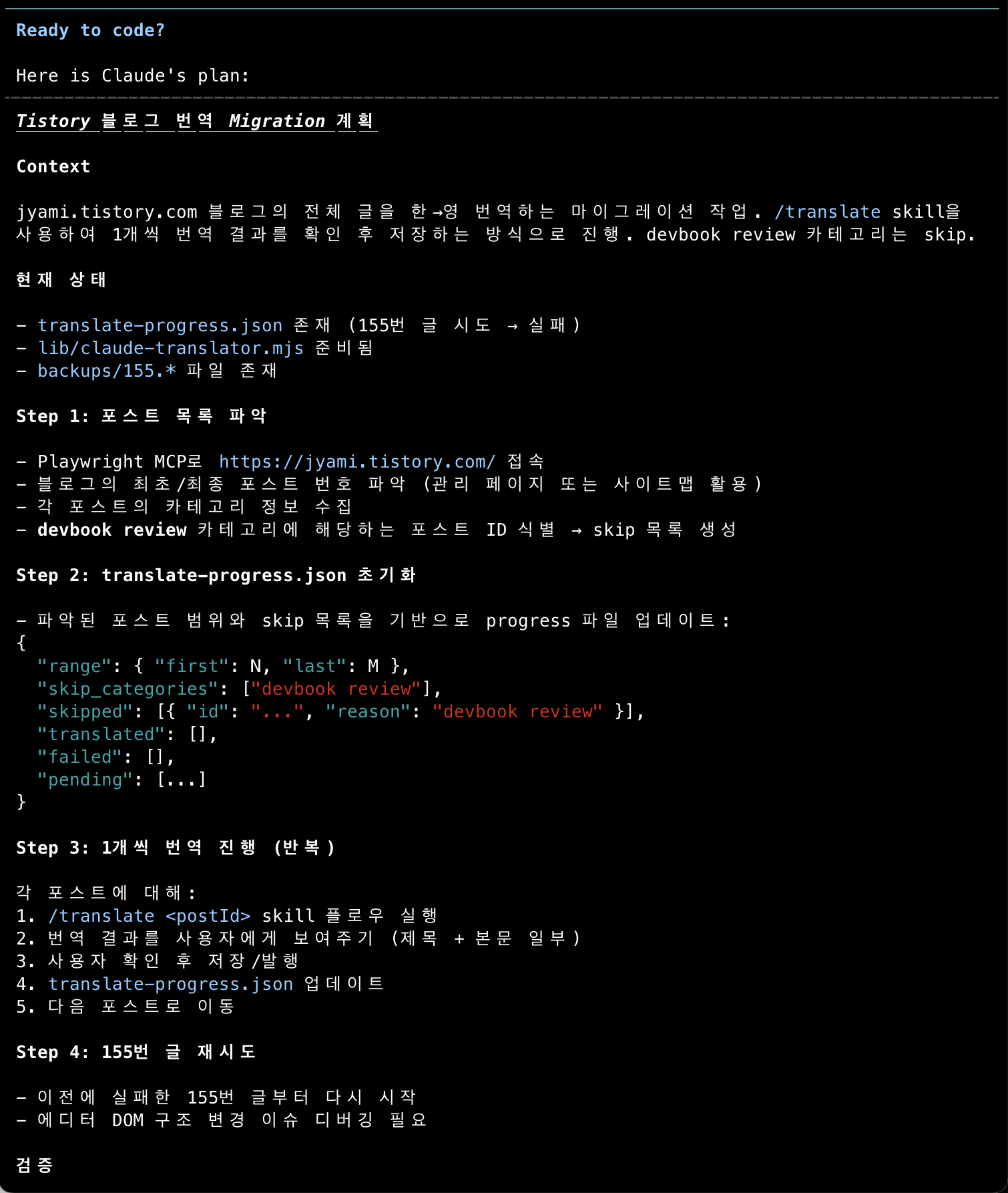 Even after the plan was ready, if I said I also wanted additional features like the reading progress bar, back to top, estimated reading time, andKorean/English toggle mentioned above, it would revise the plan accordingly and build everything on its own.