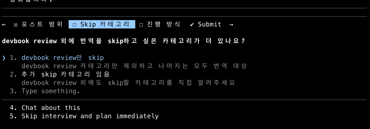 새로 발행할 글을 이 번역 pipeline 을 태워서 두개다 보여줄 수 있게 스킨을 수정했지만, 결국 기존 122개 포스트를 마이그레이션을 하는 작업도 하는게 맞았다. 그러니 자동화를 위해 /translate/translate 스킬을 만들었다!