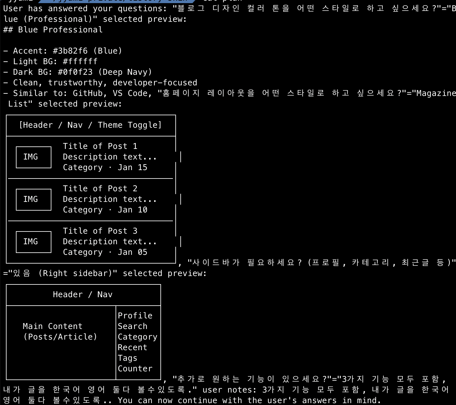 아무래도 모호한 프롬프트를 주었다보니 디자인쪽으로 구체적 질문을 던졌었다. 아래 보이는건 당시 claude 의 답변을 저장해둔것. 옵션 선택과정 화면 캡쳐해둘껄.. 그때만해도 내가 블로그를 쓸지 몰랐다.