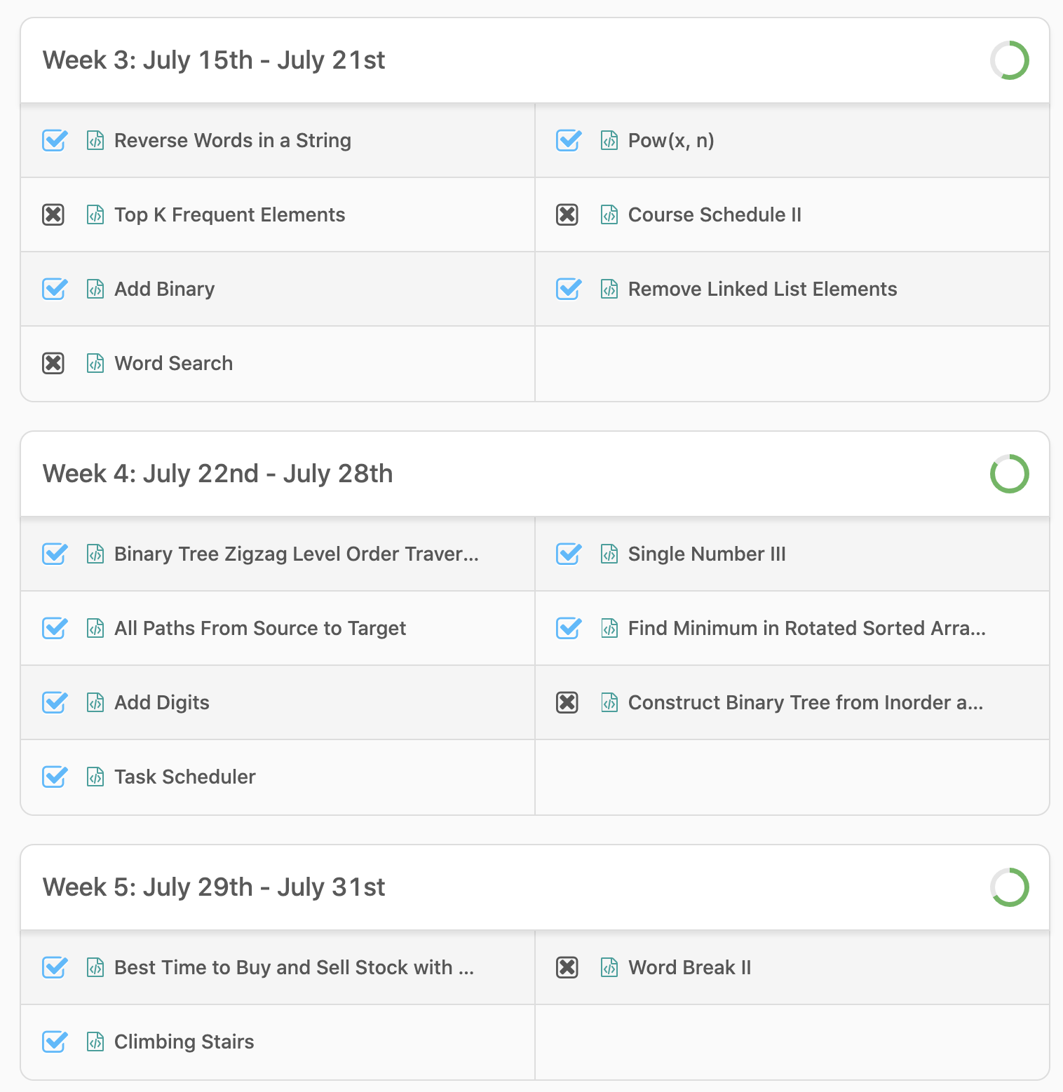 이전에 5월 챌린지, 6월 챌린지도 조금 했었는데 두번 다 그냥 대충 내가 아는문제만 풀다가(dfs, tree 문제들 푸는걸 귀찮아 해서 그런 문제가 나오면 넘겼다.) 끝까지 완주하지 않고 안했었다.
