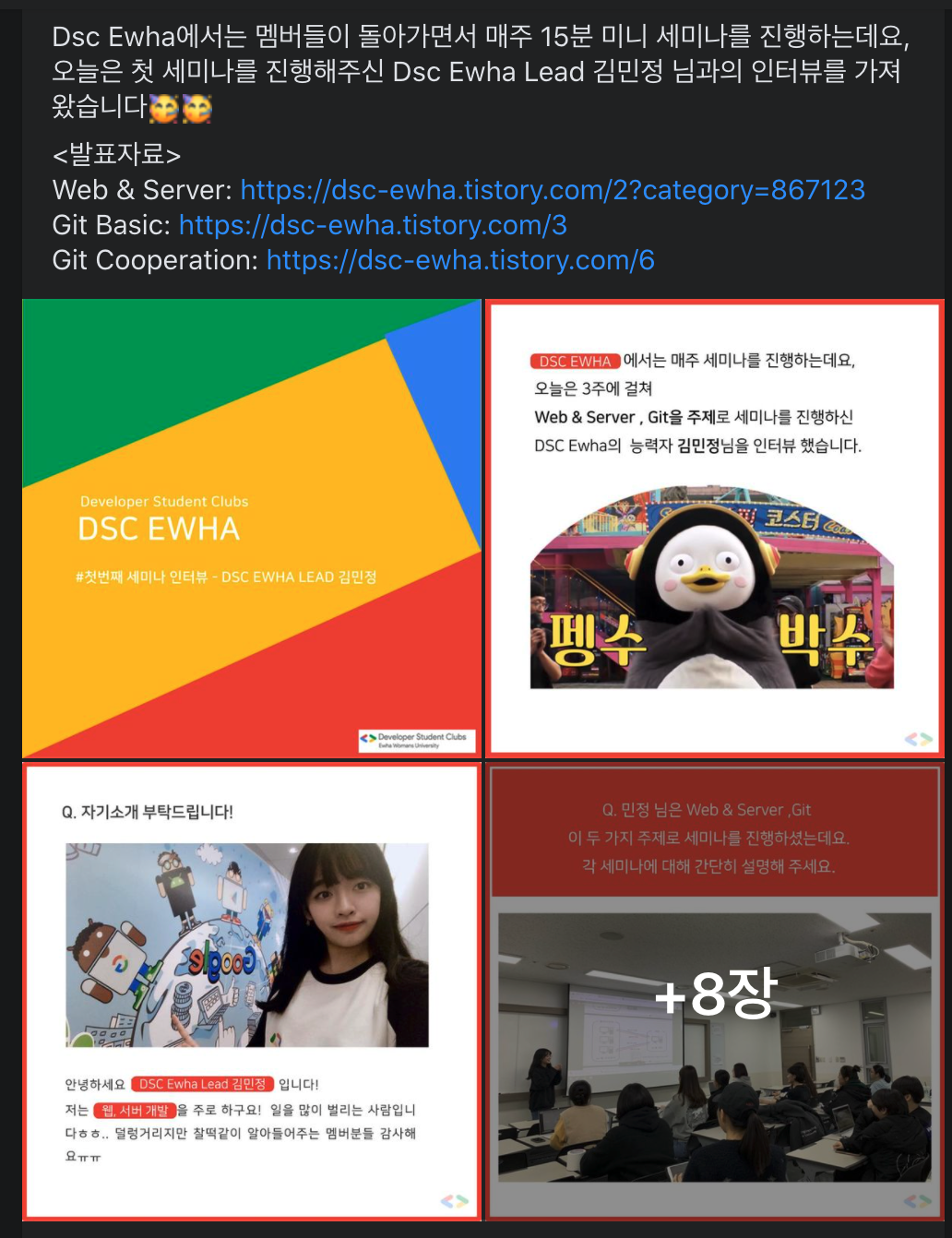 그래서 매주 모임을 가질 때 멤버별로 돌아가면서 약 15분간 미니세미나를 진행했고, 처음에는 그 세미나에 대한 간단 QnA 형식으로 DSC Ewha 페이스북 페이지(www.facebook.com/DSCEwha) 게시글을 채워나갔다.