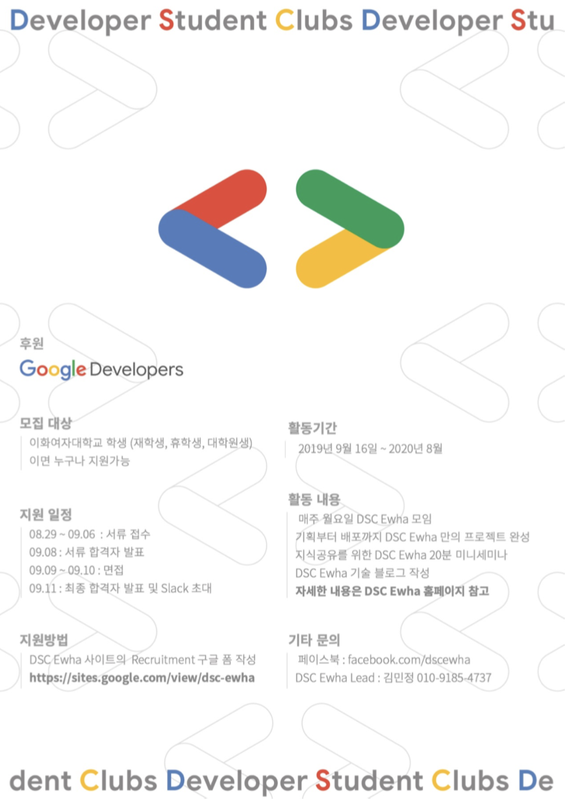 After finishing my term as the 2019-2020 DSC Ewha Lead, I prepared handover materials around September. While putting together the handover documents, I ended up organizing all my past activities — and that's how I ended up writing this blog post lol. But I never expected to be finishing it this late.. Currently, DSC Ewha is being run by a new Lead who took over. She's really talented, but because of COVID, I'm not sure how activities are going right now ㅠ