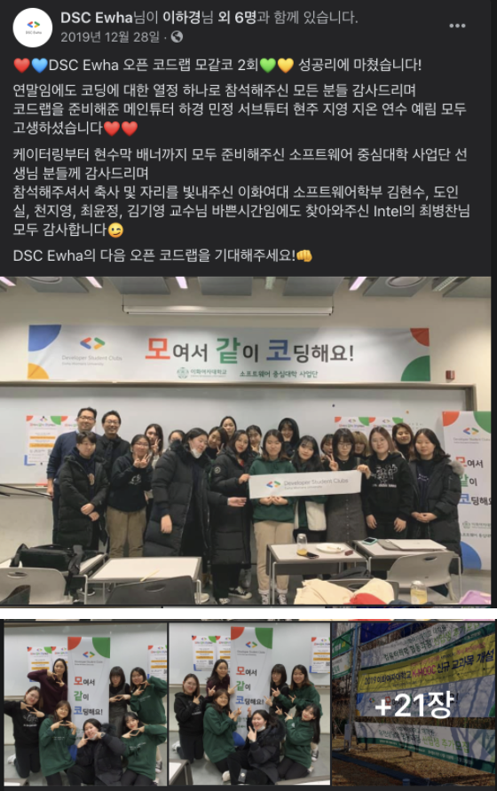 사실 대부분의 DSC 활동이 19년도에 몰려있다. 코로나로 인해 20년도 활동이 애매모호해졌고 다들 온라인으로 하다보니 동기부여가 잘 안되는 상황이었다. 만약 20년도에 코로나가 아니었다면.. 좀 더 많은 활동을 멤버들과 할 수 있었을까 하는 아쉬움이 있다.
