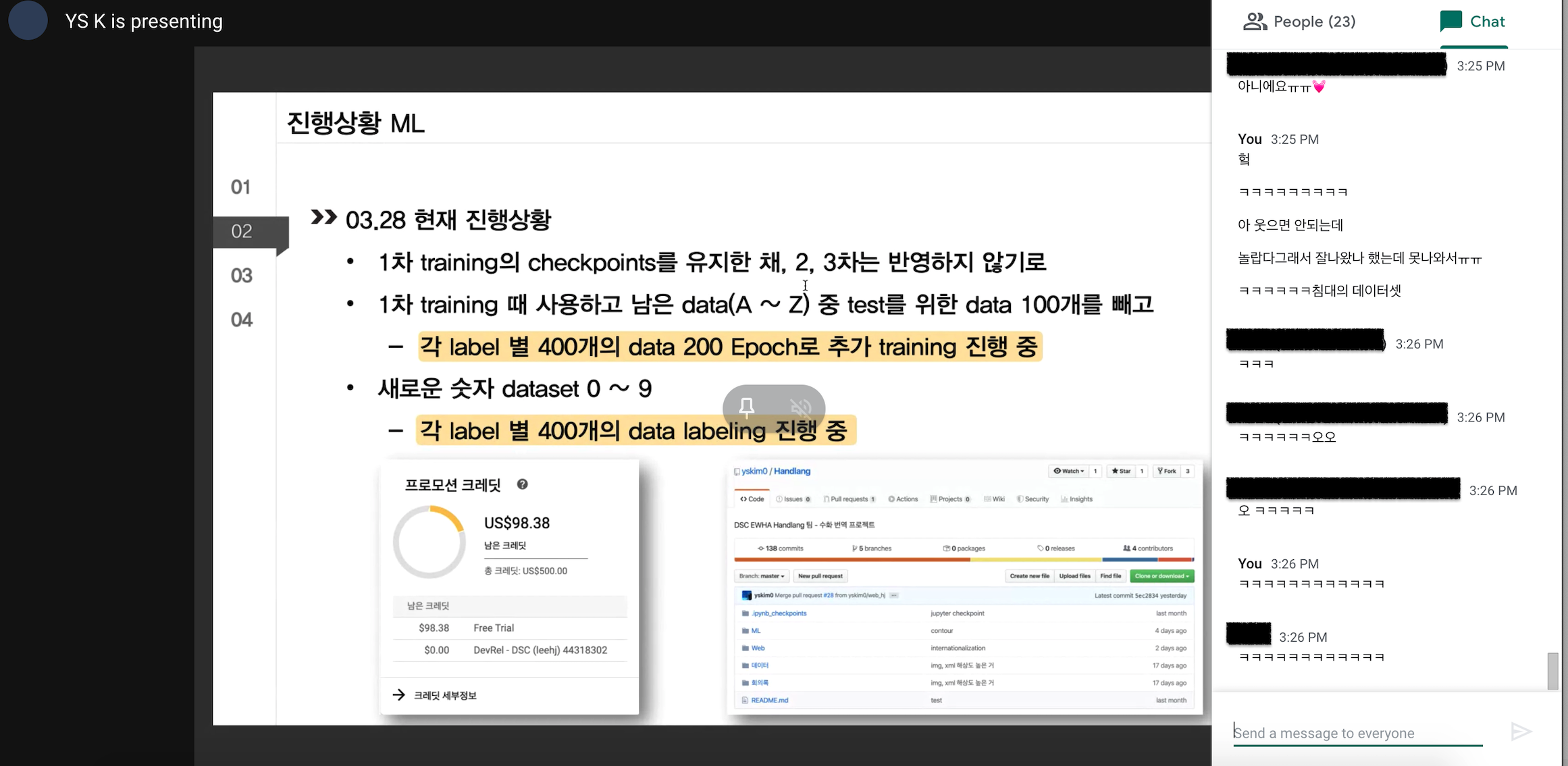 Originally, on the last day of the 70-day period, March 28th, we planned to hold a conference at school called "Ewha Jandicon" where we would present our daily commit activity records to fellow students. But once again, COVID put an end to that plan, which was disappointing.