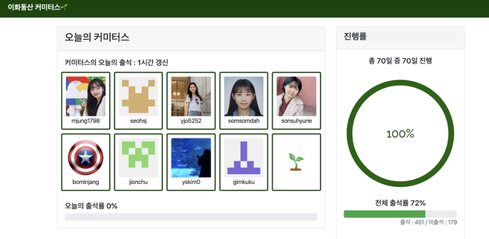 그리고 나는 개인적으로 GDG 판교의 정원사들에서 만든 커밋관리툴을 이화동산 커미터스 용도로 다시 재 배포하고, 커밋기록을 수집하는 사이트도 만들었는데, 관련 코드는 https://github.com/mjung1798/ewha-daily-commit 링크에 저장되어있다,
