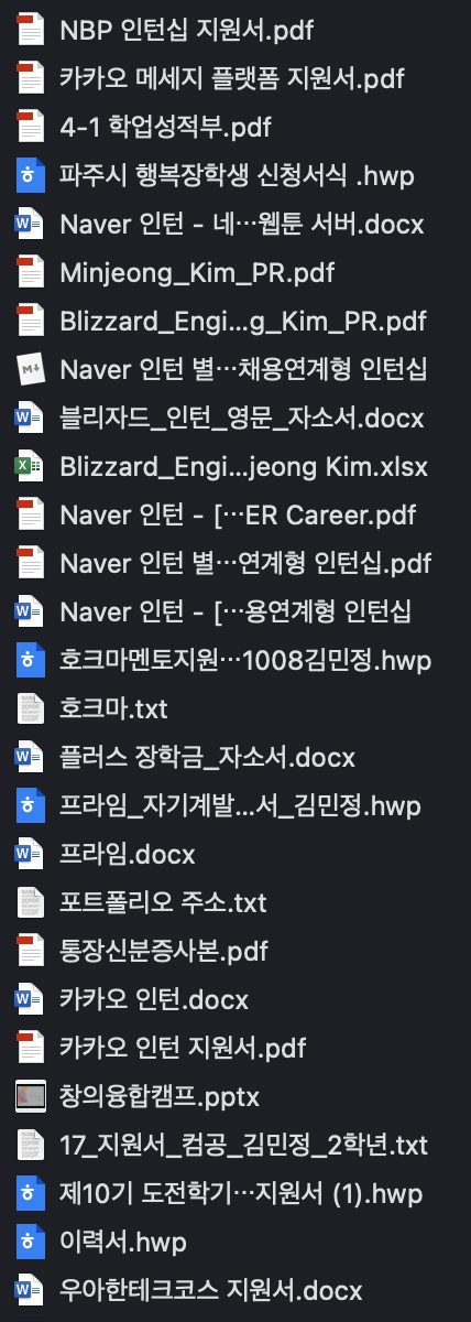 나같은 경우에는 대략적으로 위의 히스토리였는데, 사이사이에도 오픈핵, 네이버 핵데이 등 여러 활동 참여를 많이 했었다. 그런 활동을 하다보면 쓰는 지원서가 있는데, 그 지원서를 결국 쓰다보니 계속 조금만 고쳐서 조금만 업데이트해서 계속 사용하게 되었고 거슬러 올라가면 SOPT때의 지원서가 현재 사용한 자기소개서의 초안이 되었다. 따라서 본인의 방식으로 꼭꼭 잘 저장해두자.