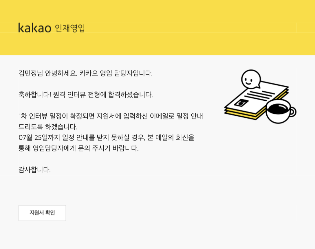 - 카카오 수시채용 : 서류 합 > 코테 합 > 전화 면접 합 > 1차 면접 합 > 2차 면접 합 > 최종 합격 > 취뽀