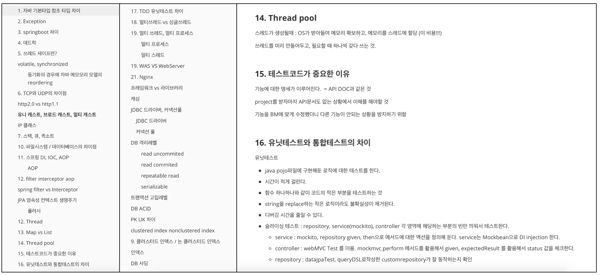 주언어(Java)와 관련한 내용 공부를 해도해도 끝이 없다. 자바 기준으로 컴파일타임 런타임타임에 대한 질문, 내부 JVM 구조, GC, 메모리 저장, 람다, 함수형 프로그래밍, 스트림 등등 언어안에도 너무 많은 내용이 있다. 성능뿐만 아니라, JVM같은 경우엔 운영체제와도 연관되는 내용이며 자바 thread 역시 현업에서의 동시성 프로그래밍을 위한 기초이다. 언어를 공부하다 보면 컴퓨터 공학 지식과 연관되는 부분도 많이 나와서 나는 자바 공부를 진짜 열심히 했었다. (재밌기도했다..) 그러다보니 자바 관련 질문에서는 대부분 답변을 할 수 있었다.