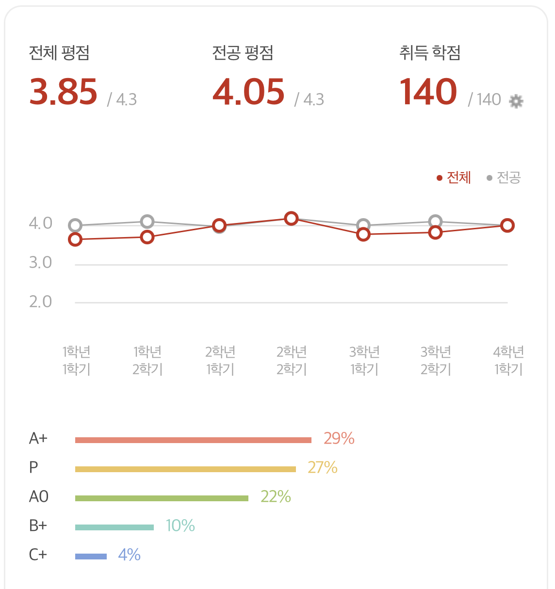 이 프로젝트로 전공 6학점을 받게 되었고 나는 졸업 이수요건인 140학점을 모두 채울 수 있었다. 그래서 나의 대학교 학점은 4.3 기준 3.85 / 4.5 기준 4.03으로 마무리하게 되었다. 사실상 4학년 1학기 2학기는 모두 회사생활로 인해 패논패 수업을 들었기 때문에 내 학점은 사실상 3학년 때 완성을 시켰다.