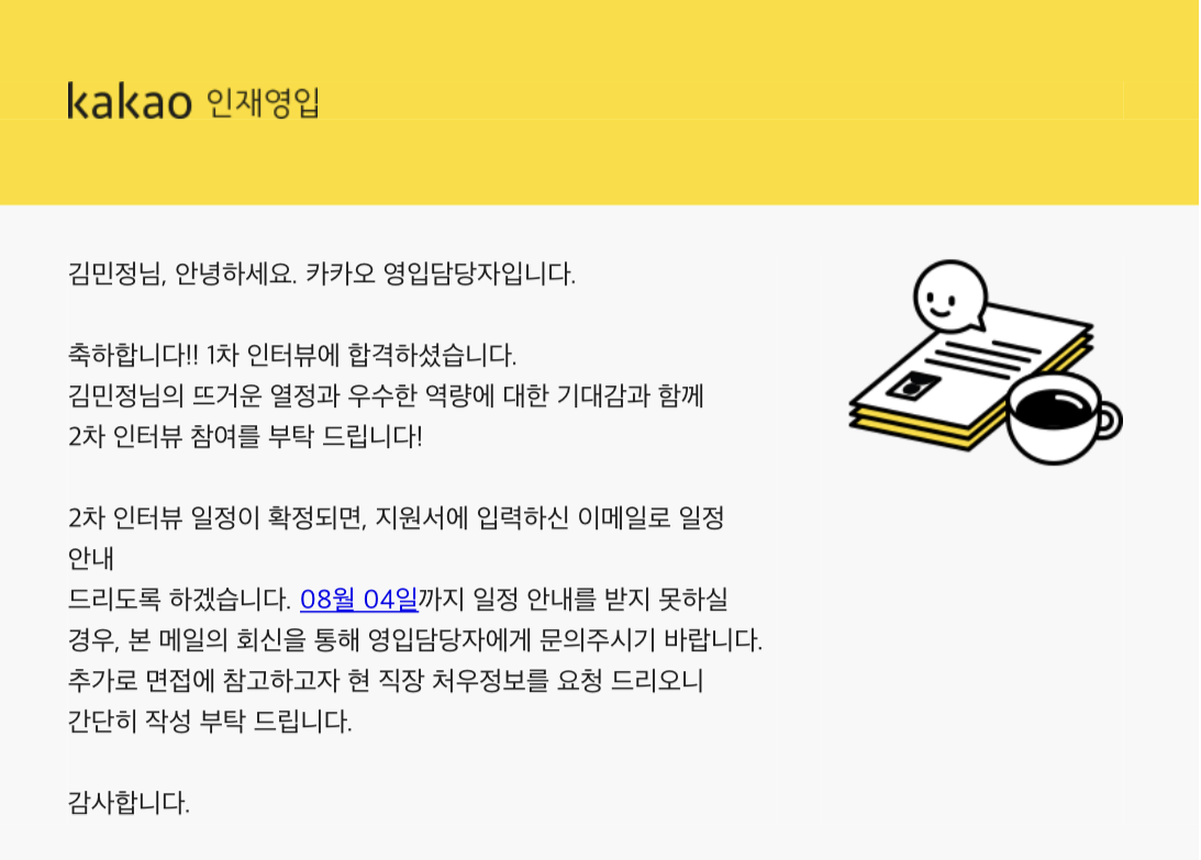 내가 서류를 넣은 4곳 중 가장 가고 싶었던 곳은 카카오였다. 사실 그래서 최종 합격 발표가 난 나머지 두 곳이 시기는 더 빨랐지만, 가장 가고 싶었던 곳이 여기었기에, 두 곳 모두 계약서 작성을 거절하고 여기 면접에만 집중했었다.