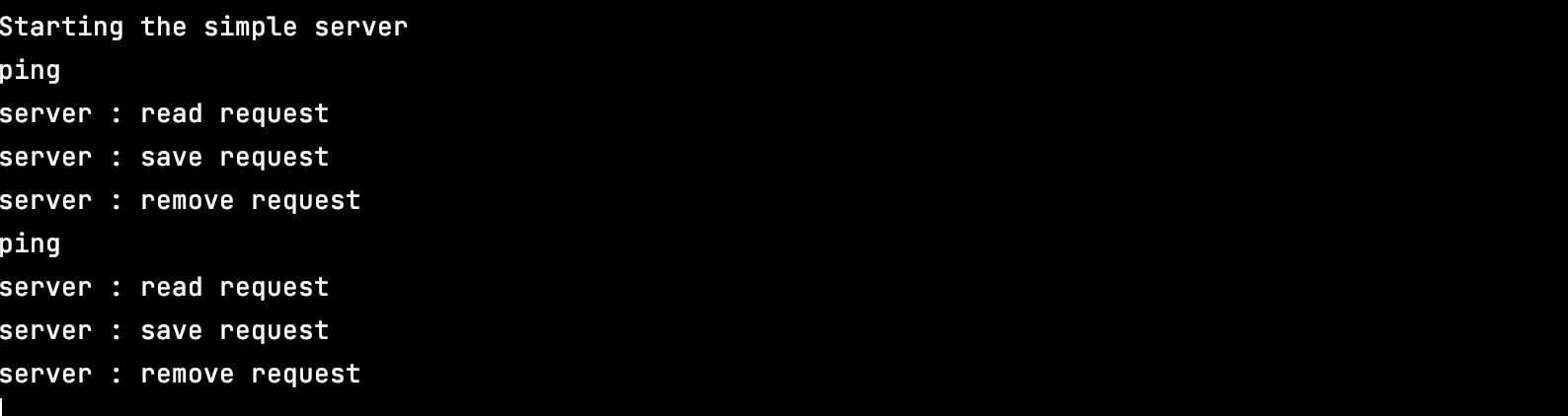 클라이언트로부터 ping, read, save, remove, ping, read, save, remove 요청을 받아 처리하였다.
