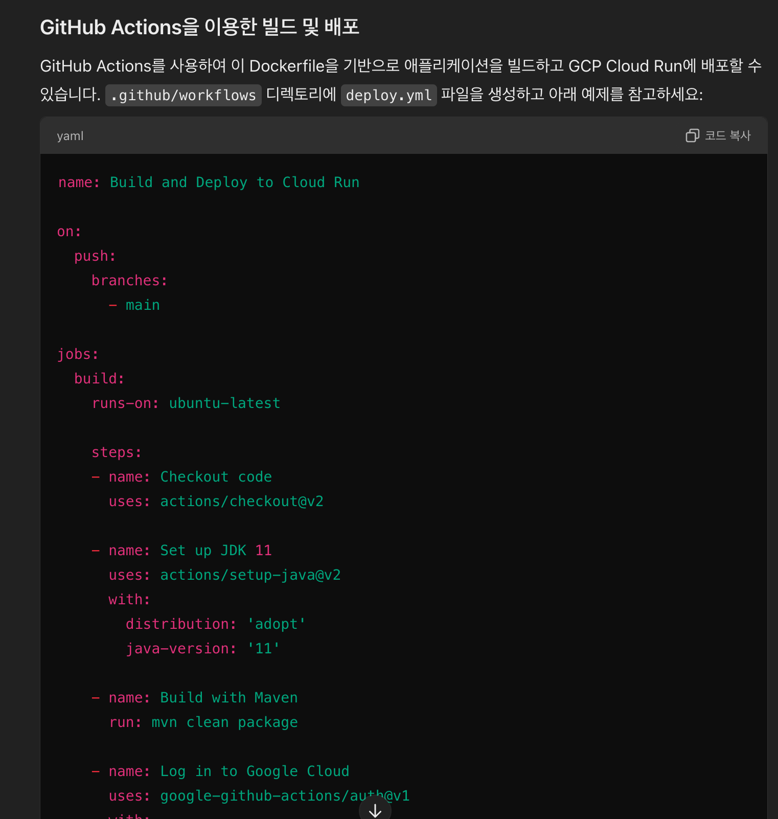 회사에서는 CI/CD를 jenkins로 하고있어서 github action을 처음써봤다. github action에 대해서 좋다고 좋다고 말만들었지 처음 써보는거라 ansible 문법 익히듯이 action 문법들을 익혀야하는건가 싶었는데 와 요즘 개발은 GPT를쓰는구나?
