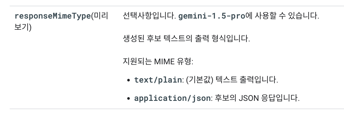 vertex api 스펙에 보면 response의 출력형식을 결정할 수 있는 요청 필드가 있는데 이 필드가, VertexAiGeminiChatModel 에서는 구현이 되어있지 않은 상황이었다. 우리 공모전에서 사용할 prompt에서는 이 필드를 꼭 넣어야 json 타입으로 응답이 올바르게 오는데 지정을 하지 않으면 parsing 에러로 500에러가 간간히 떨어지는 경우가 있었다.