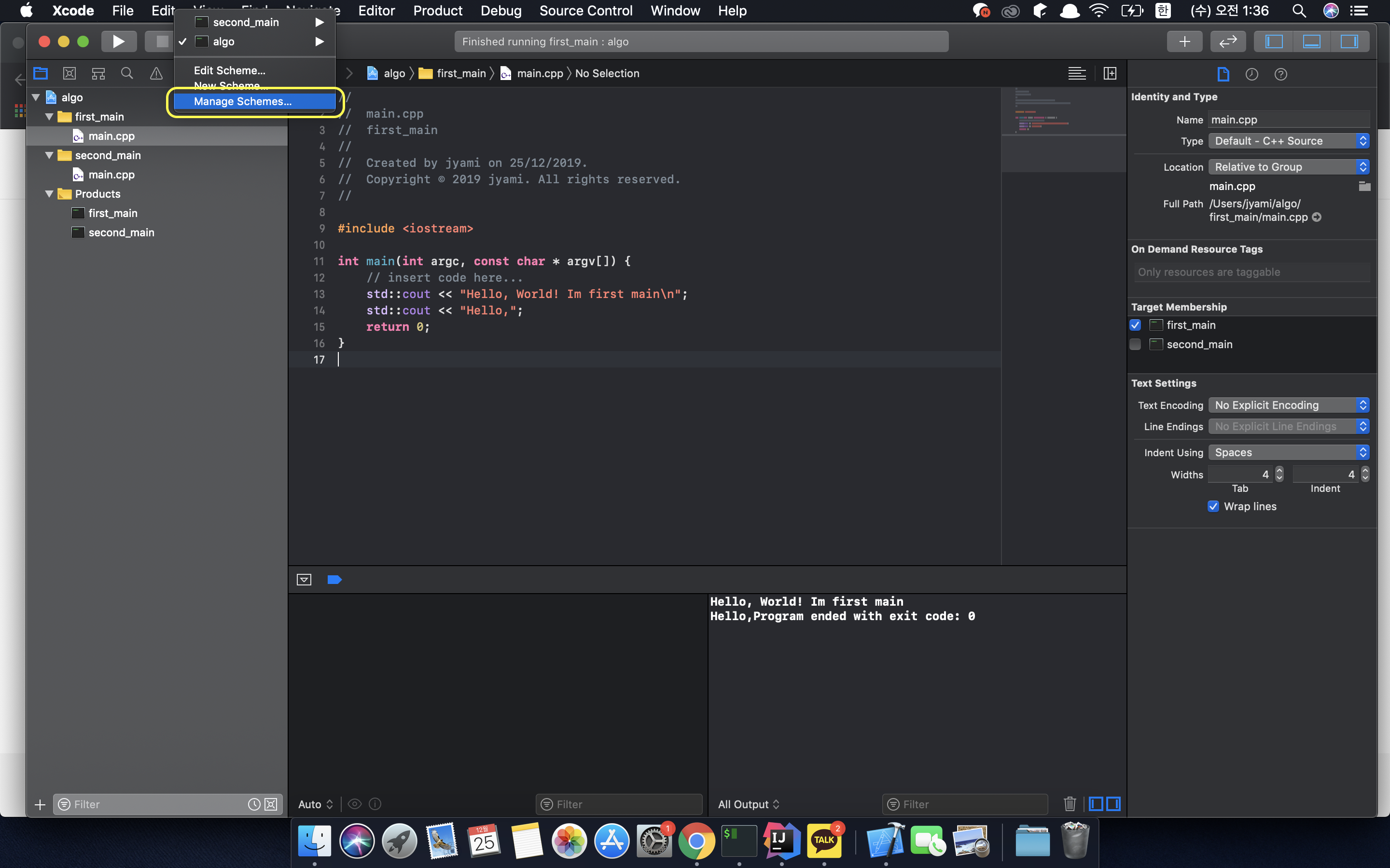 6-3. 위에 있는 Run에는 여전히 algo로 떠있습니다. 이대로 실행을 할 경우에는 algo에서 first_main으로 target명만 바꾼 것이기 때문에 first_main > main.cpp를 새로 작성하고 재 컴파일을 해도 올바르게 컴파일이 됩니다. 하지만, 나중에 헷갈릴 가능성이 있기 때문에 run을 위해 사용하는 Target이름 명 역시 바꾸어 주기 위해 Run 옆에 있는 Target 선택에서 Manage Schemes를 클릭합니다.