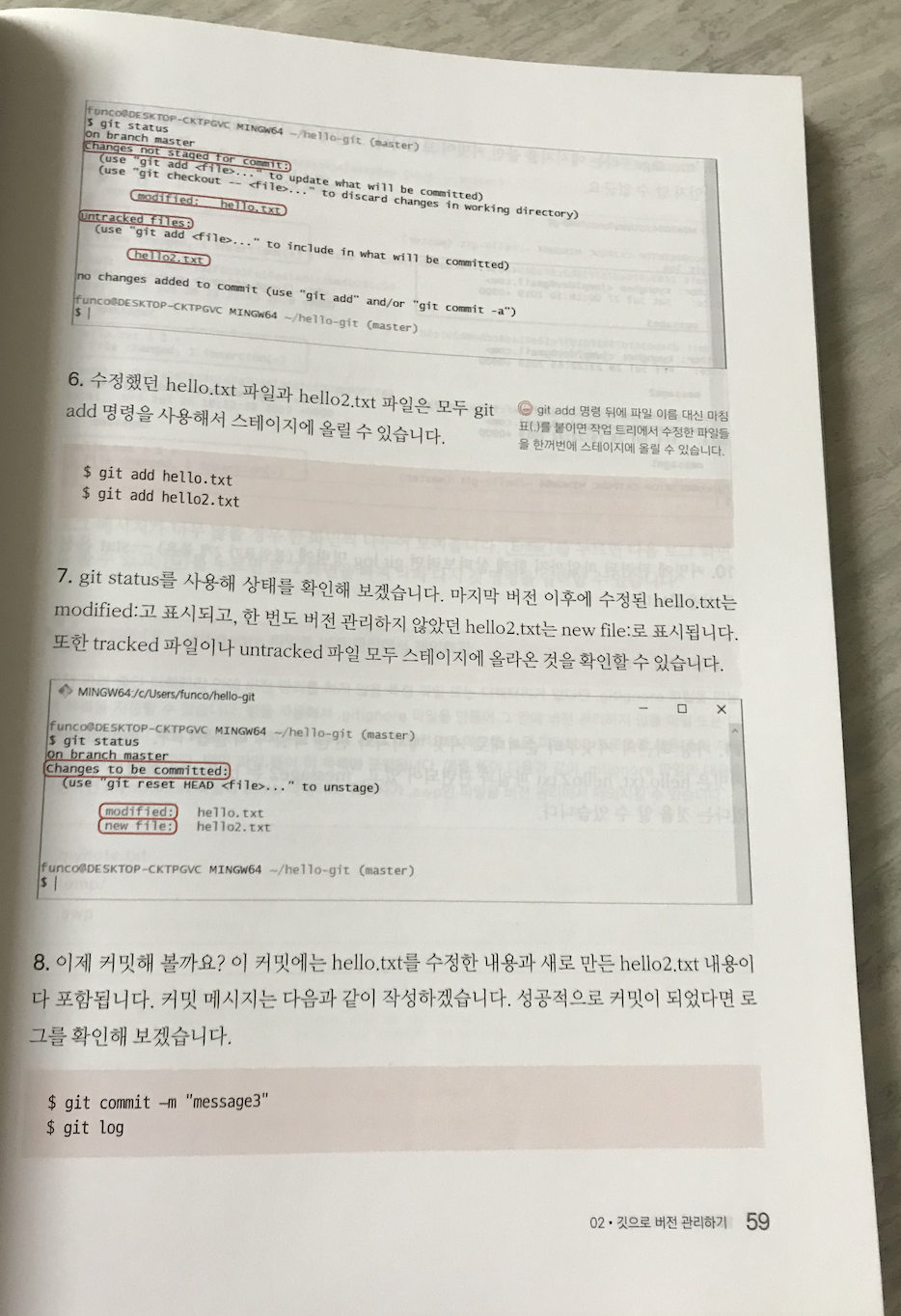 02장 깃으로 버전 관리하기 02-1 깃 저장소 만들기 02-2 버전 만들기 02-3 커밋 내용 확인하기 02-4 버전 만드는 단계마다 파일 상태 알아보기 02-5 작업 되돌리기 02장에서 꼭 기억해야 할 명령 |