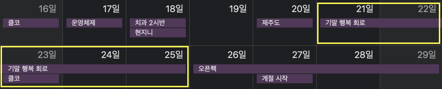 18년부터 19년 초까지 못 쉬었다. 중간 > 핵 데이 준비 > 핵 데이 > 기말 > 종강 > 솔트 앱잼시작 > 스마일게이트 시작 이렇게 일이 몰아쳤었던 거에 번 아웃이 와서 모든 동아리를 관뒀다. 모든 대외 활동을 관두고 학교 공부만 하려 했는데, 이제 3학년이니까 동기들이 막 블록체인 학회부터 각종 동아리 프로젝트를 하는 걸 보고 나도 뭐 해야 하나 싶고 그랬었다. 그리고 3학년 1학기는 유독 암기 과목이 많아서 학교 다니면서 가장 공부로 스트레스받았던 학기였다.