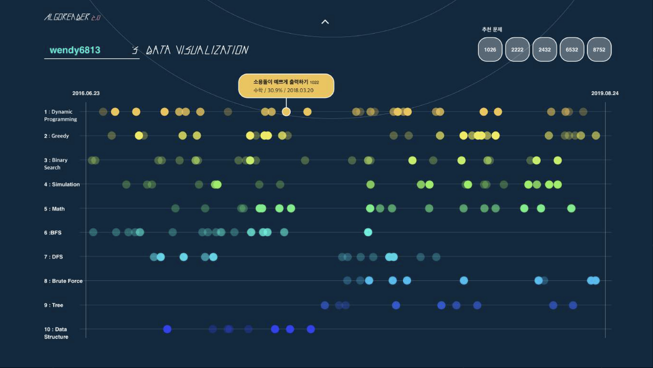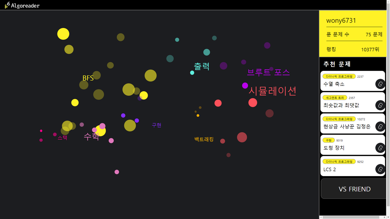 백준 알고리즘을 난이도, 분류별 빈도에 따라 원의 크기를 다르게 해서 보여주는 서비스였는데, 이때 개발할 때만 해도 내가 푼 백준 알고리즘 수는 17문제였다. 알고리즘에 취약한 사람임 2020년에는 알고리즘에 시간을 많이 투자하려 한다. 풀다 보니까 생각보다 재밌기도 하고 무엇보다 코딩 테스트가 너무 두렵다