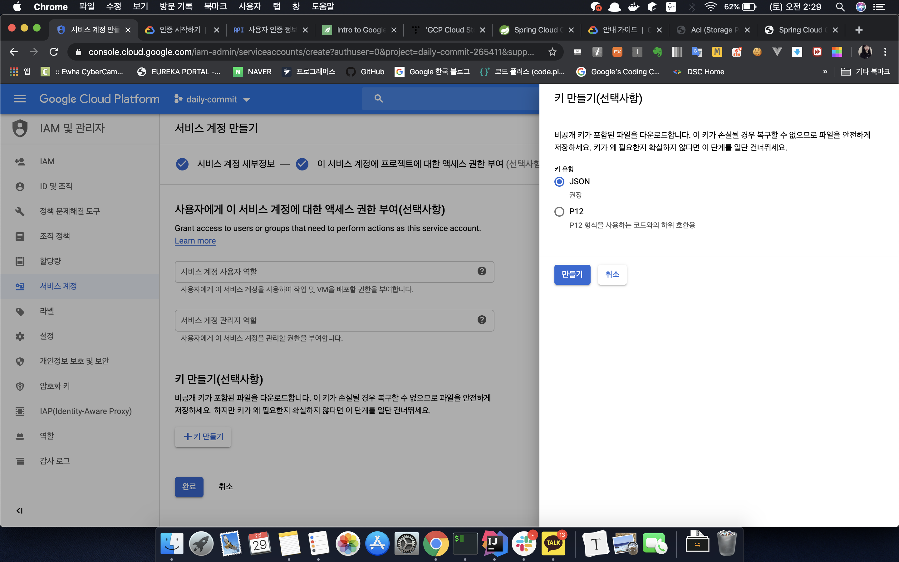 따라서 Springboot에서 내 프로젝트의 Cloud storage에 접근권한을 가질 수 있도록, Access Key를 받아 등록해야한다. 탐색 창을 켜서 IAM 및 관리자 > 서비스 계정 탭으로 들어가 서비스 계정 키를 생성하자.
