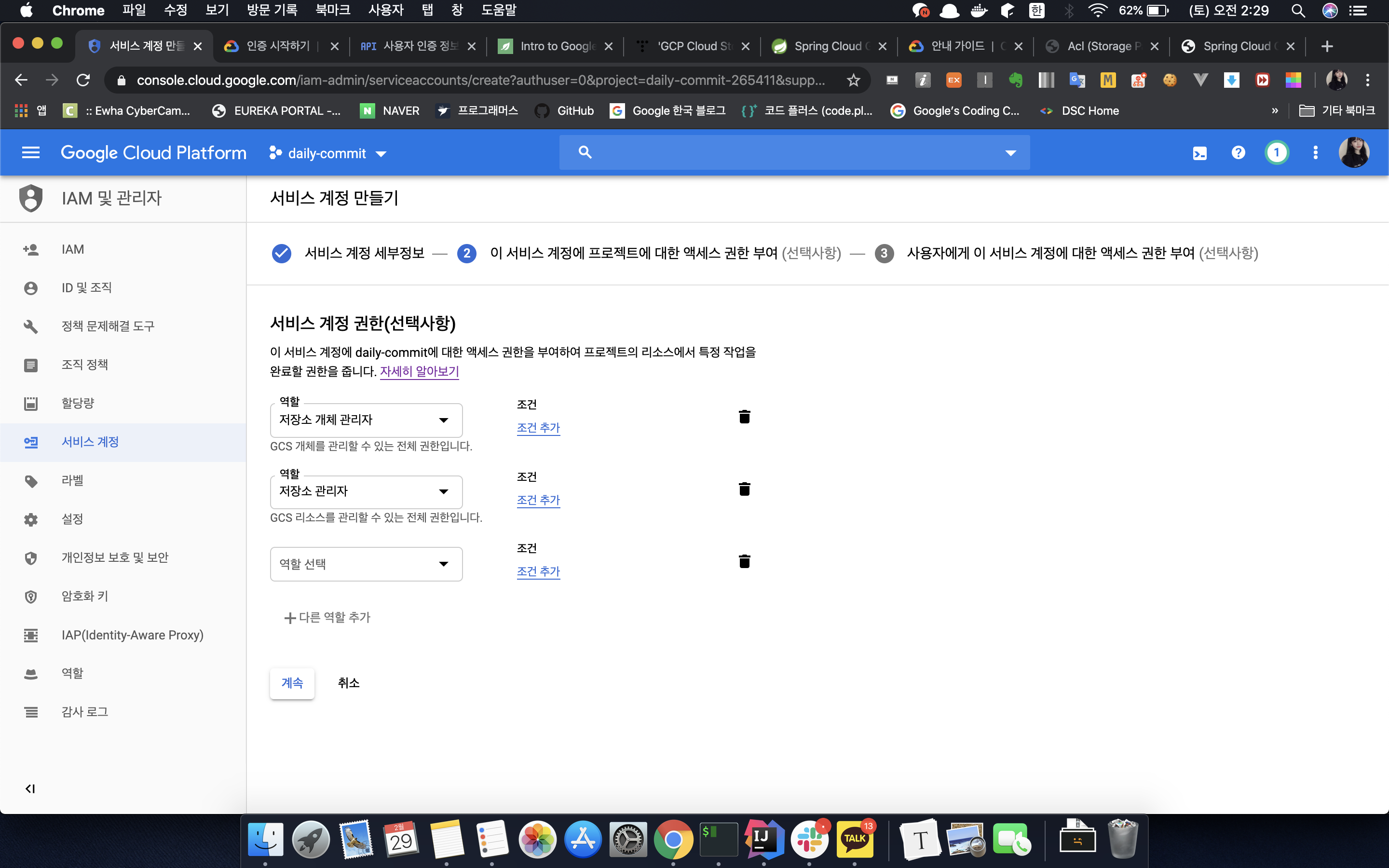 2. 내가 생성할 서비스 계정의 권한을 설정해준다. (이 서비스 계정으로 storage object와 관련한 권한을 추가했다. )