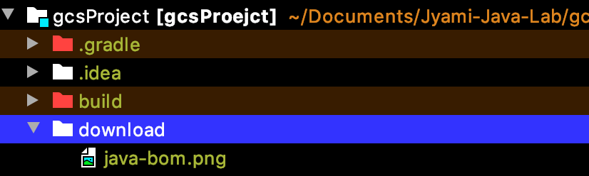 download 폴더를 추가해준 후, API를 호출하니 내 로컬 프로젝트 안에 GCS에 있던 파일은 java-bom.png파일이 잘 다운로드됨을 확인할 수 있다.
