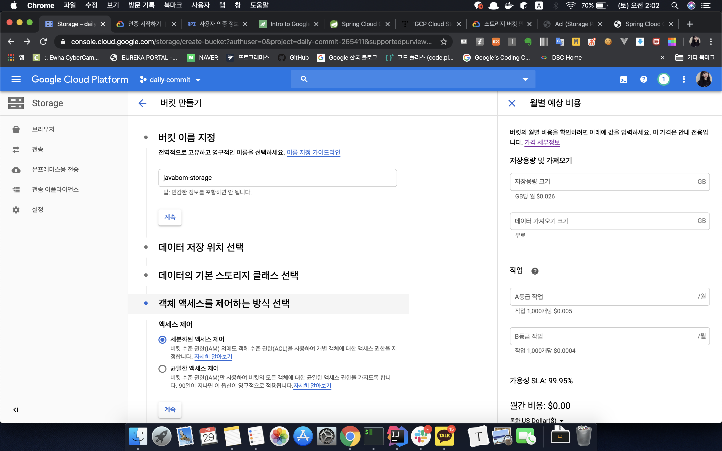 스토리지 브라우저에 들어가서 버킷생성을 누르면 다음과 같이 버킷을 생성할 수 있다. 저장 위치, 데이터 클래스부터 시작해서 storage 라벨까지 고급설정을 세팅할 수 있다. 나는 javabom-storage라는 버킷을 생성했다.