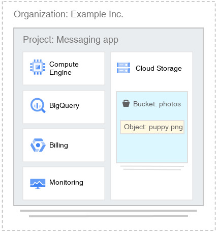- Project : 각각의 프로젝트는 하나의 어플리케이션과 연관되어있으며, 각각의 프로젝트는 고유한 cloud storage api와 resource를 가진다.